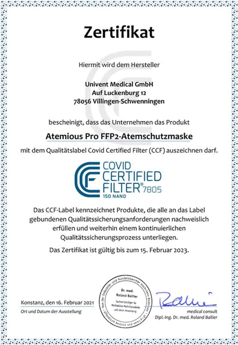 Made in Germany: Die von der Firma Univent Medical GmbH aus Villingen-Schwenningen hergestellte Mundschutzmaske atemious Pro Maske CE 2163 besitzt das CCF-Siegel.